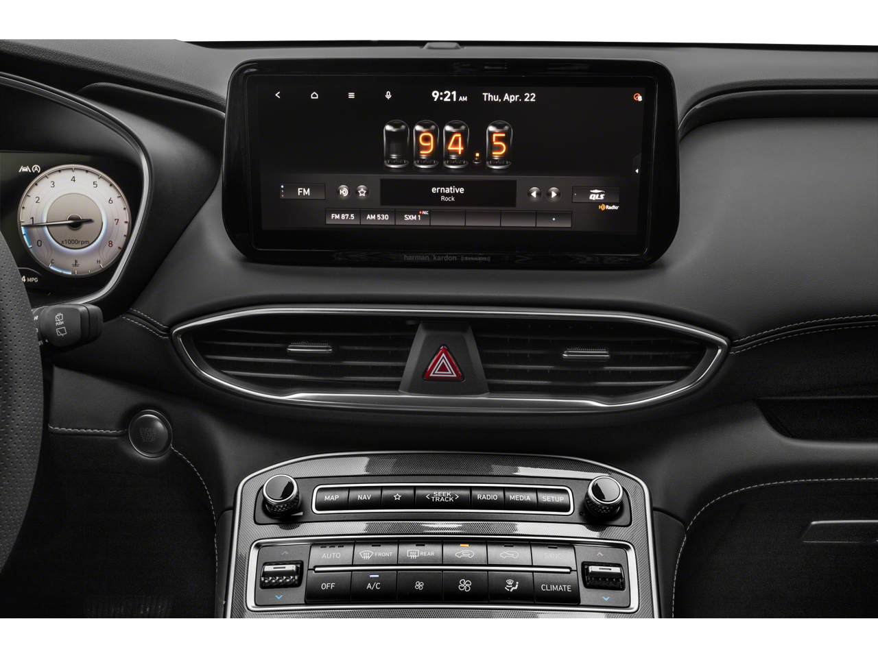 - Radio: AM/FM Harman Kardon Display Audio -inc: 10.25" display screen, Apple CarPlay and Android Auto, Bluetooth® hands-free w/wireless audio streaming, steering wheel audio and phone controls, dual front USB ports, SiriusXM, HD Radio, Blue Link connected car system, 12 speakers including subwoofer, external amplifier, Clari-Fi music restoration technology, QuantumLogic surround, navigation system w/traffic flow including incident data via HD Radio (HERE), rear seat quiet mode and wireless device charging